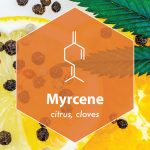 Myrcene is the most prevalent cannabis terpene, representing roughly 20% of all terpenes in commercial marijuana. It gives off a distinct smell that resembles clove. The aromatic compound is also found in high quantities in mango, basil, lemongrass, and hops, a key ingredient in IPA beer. It has a calming, mild sedative effect and is also an analgesic. | Myrcene Strains to Try – OG Kush, Granddaddy Purple, Northern Lights, Green Crack, Grape Ape
